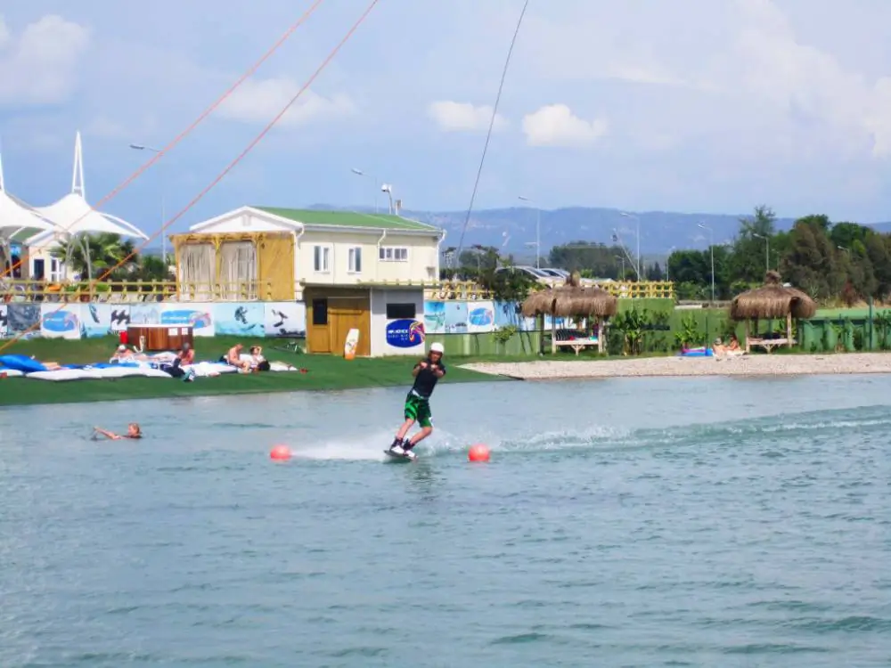 Действительно оказалось очень много «нашего» народа. Повсюду слышна русская речь, иногда даже забываешь, что ты заграницей. Ну и вообще как то так всё положительно сложилось, мы влились в общую атмосферу плавно и сразу как то стали чувствовать себя там как дома. Все вокруг свои и всё вокруг родное. Опасения о наличие больших очередей и толпы жаждущих покататься не подтвердились. Был «лагерь» из Москвы, «лагерь» из Киева, большая группа поляков. Народ разного уровня катания, разного возраста, от семилетних детей до сорокалетних женщин. Парни конечно вытворяют сумасшедшие вещи, я еще не так хорошо ориентируюсь во всех трюках, поэтому блеснуть словарным запасом не могу. Тренировки у них шли каждодневные: с утра разминка на большой лебедке, потом тренировка на реверсе, обед, отдых и уже пошло исполнение трюков снова на большой лебедке. Возникает ощущение, что ты смотришь нескончаемый клип о вейкбординге и жизни райдеров. Очень мне понравились скейтеры (которые вейкскейтеры), их было там достаточно много — девчонки и парни. Смотрится это конечно весьма не обычно — когда ты видишь что он или она прыгает в кроссовках на свой скейт на воду и каким то не понятным образом продолжает движение, при этому умудряясь исполнять развороты, прыжки, заезжать на фигуры, не теряя доску. Мне кажется, что я хочу так же — это мысль у меня засела еще там, и теперь я её вынашиваю, видимо до очередного моего порыва освоить что-то новенькое. Местный народ (я имею ввиду турков) очень активно катается. Приезжают обычно к вечеру. Брутальные такие парни, видимо закаленные, без гидрочей, без шлемов, в прокатном жилете и на прокатной доске, видно что и стартует не очень уверенно — но заезжают на все фигуры, прыгают, и при этом не падают! Для меня до сих пор загадка как это так может быть.