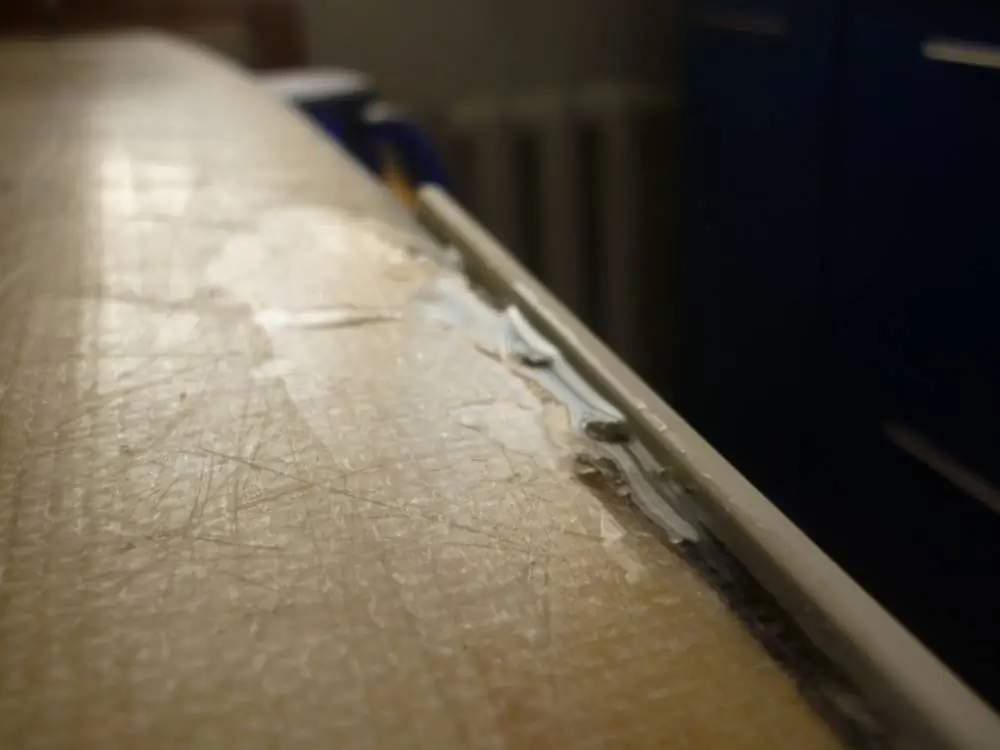 Так как царапина у меня была с краю доски, на самый край я приклеил на «Момент» кусок кабель-канала. Чтобы в последующем смола не стекала, а оставалась на месте повреждения. Сильно его клеить не надо, ибо кабель-канал все равно потом отрывать.