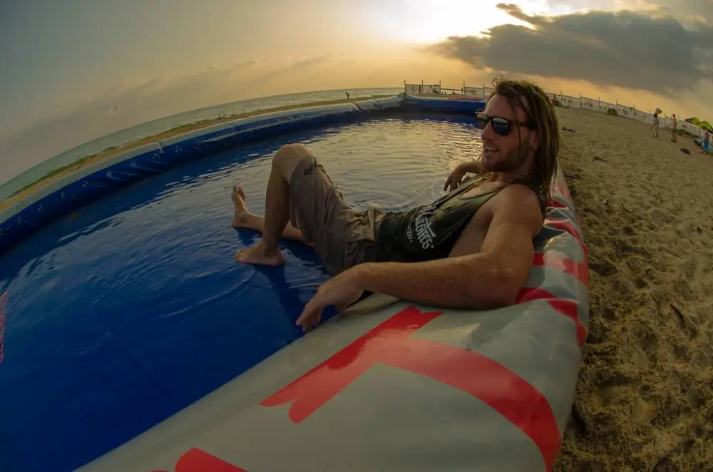 Сегодня погодные условия не позволили нашим райдерам показать свое кайт-джиб мастерство. Мы подготовили парк к завтрашнему северному ветру и отправились на зону фестиваля BeeCamp, чтобы протестировать специяльно подготовленный для ским-бординга бассейн.