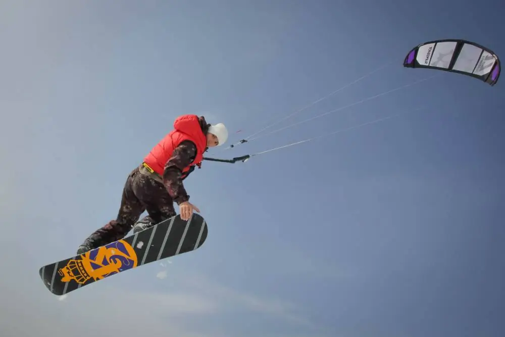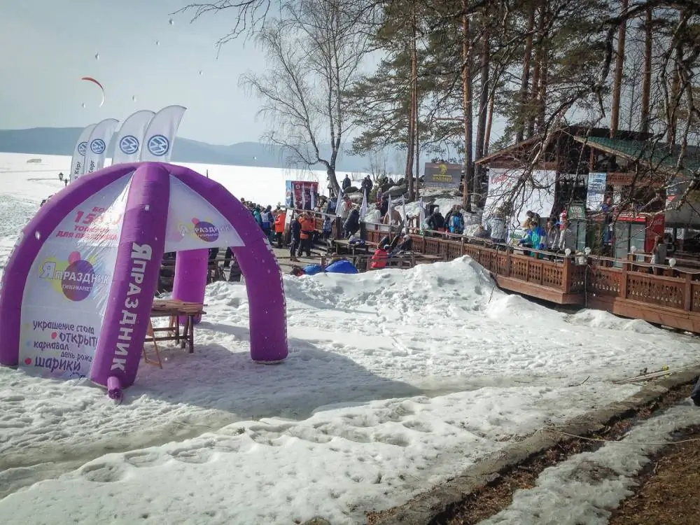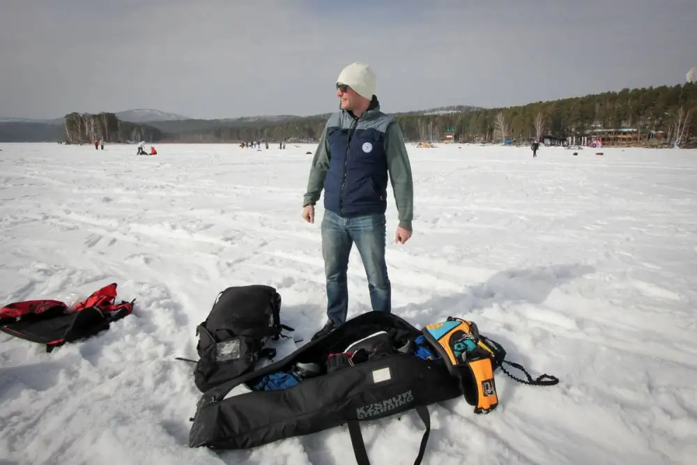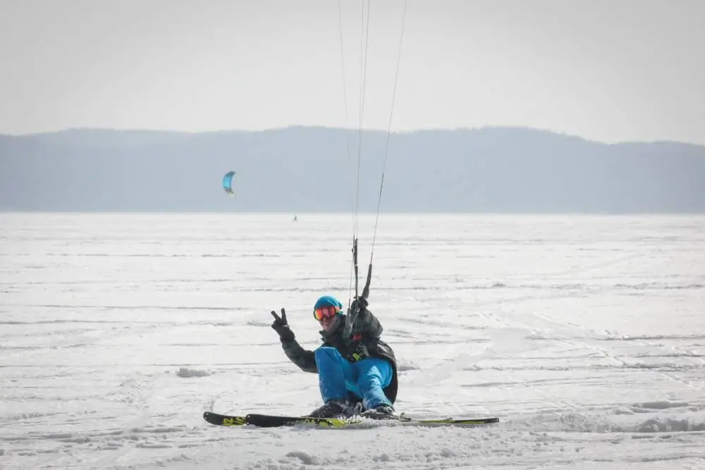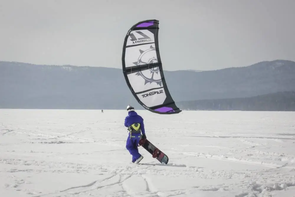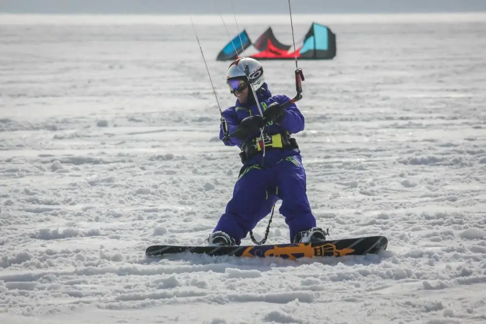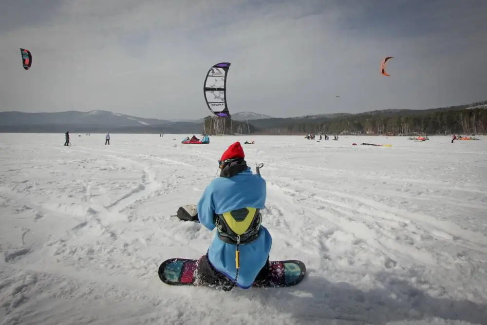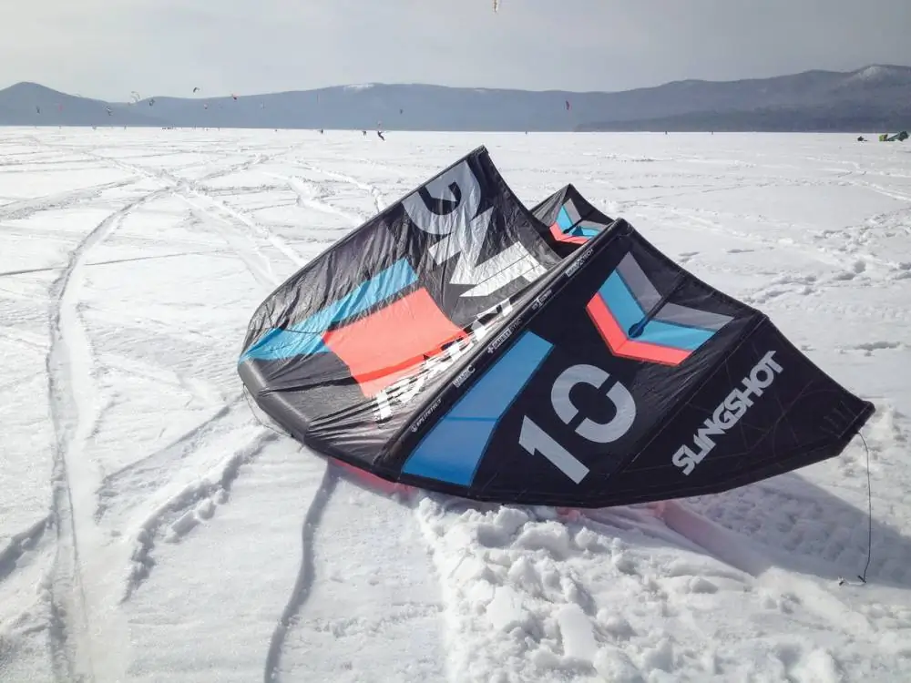 В районе двух часов уже не было и следа от утренней дымки. Ярко слепило солнце и плавило снег. Ветер дул ровный как из фена в районе 4-6 м/с с небольшими усилениями в районе места самого старта. В наличии были кайты 10 и 17 размера. Накачали все. Тестовая 10 метровая модель Slingshot Rally 2016 года довольно бодро возила меня даже в слабый ветер. Одним гласом уехав до острова, размялся, и вернулся обратно. Ребята, кто остался возле берега «стреляли» в небо на 17 метровых кайтах на радость фотографов и гостей фестиваля. Думаю, что выражу общее мнение, если скажу, что на следующий год нужно планировать некий фановый фристайл контест, который в первую очередь проводить для зрителей, а не призовых мест. Многие подходили и интересовались, насколько высоко можно прыгнуть, откуда берутся кайтеры и сколько стоит один раз прокатиться.
