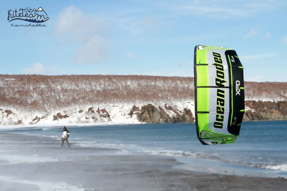 И так, условия и погода были как всегда отличными, ветер западный от 6 до 15 м/с, мы собрали девятые кайты и ринулись в бой к самому океану, испытывая снежное покрытие и ветровые зоны нового для нас места. От места старта до океана при западном попутном ветре можно долететь минут за десять, но один наш кайтерцкий товарищ, обновил новый спот – повесив на дерево свой парафоил. Операцию по спасению кайта провели оперативно, но пару разрезиков от старой каменной камчатской березы кайт все же получил и мы транспортировали на прицепном устройстве нашего коллегу к месту старта при помощи кайта буксира.