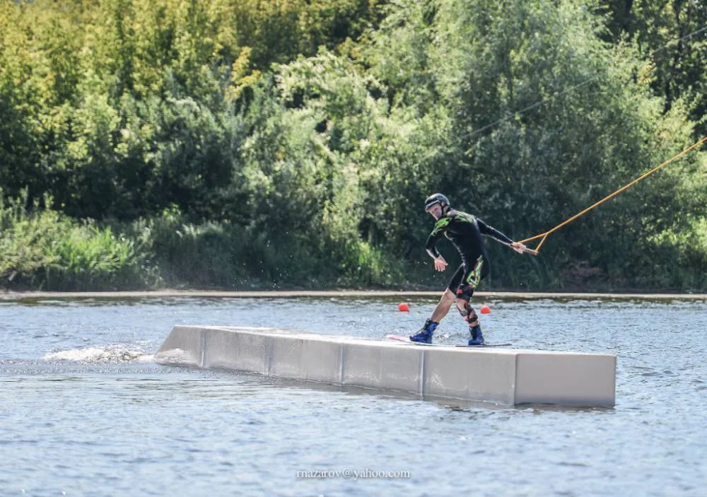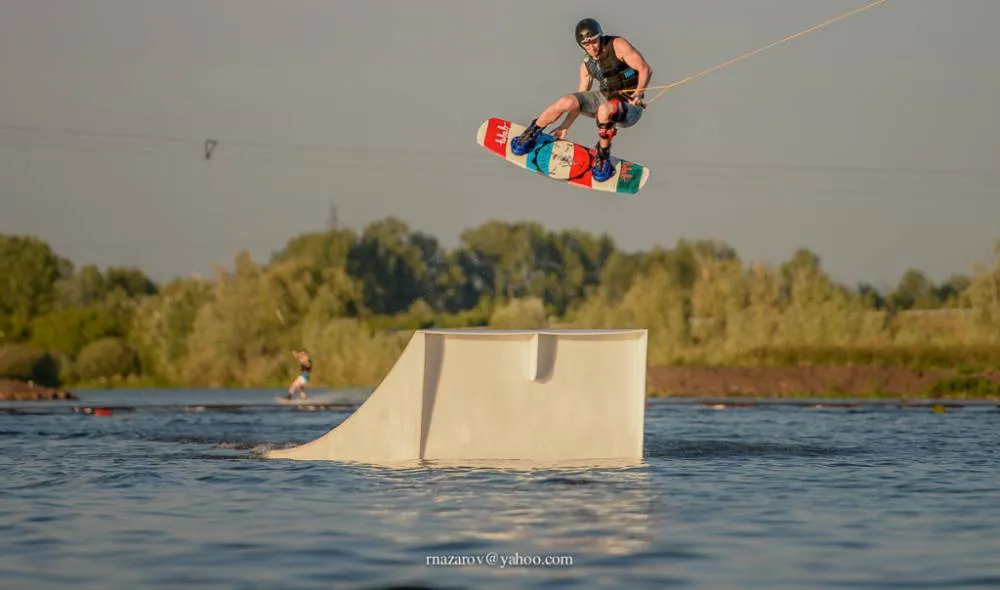 К лебедке. Тянет отлично, поднимает высоко — прыгать флет можно на всем протяжении кольца, причем это не перебор, как в Калуге (где надо себя притормаживать, чтобы не размазало об воду); фигуры от Drop (кикеры, фан-бокс) и от Vertigo (бокс и труба). Геометрия кикеров снята с TWP`ных — они достаточно крутоватые по сравнению с Unit, но на второй день катания, мы уже привыкли и проблем особых радиус не вызывал. Короче, получился полноценный парк с минимальным набором фигур, организаторы обещали добавить еще обстаклов. В ближайшие 2-3 года в Самаре появятся новые кабельные бойцы и составят конкуренцию спортсменам из других регионов России…